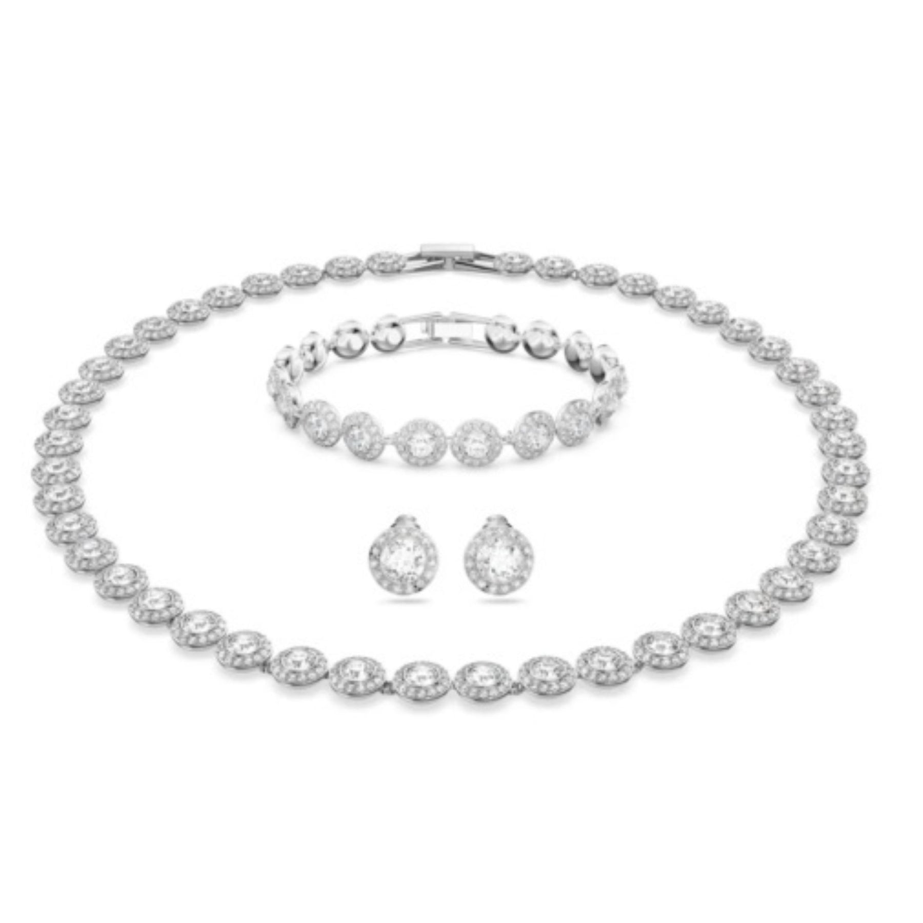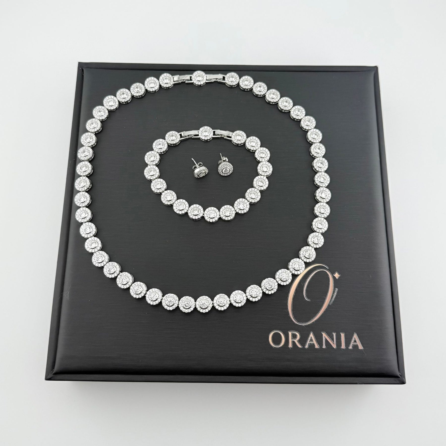 Un set complet format din colier, brățară și cercei, cu linie elegantă și strălucire uniformă datorită pietrelor de zirconiu. Zirconiul este o piatră sintetică de înaltă precizie, creată pentru a reproduce focul și transparența diamantului. Datorită structurii sale cristaline și indicelui ridicat de refracție, oferă reflexii spectaculoase și o claritate aproape perfectă.