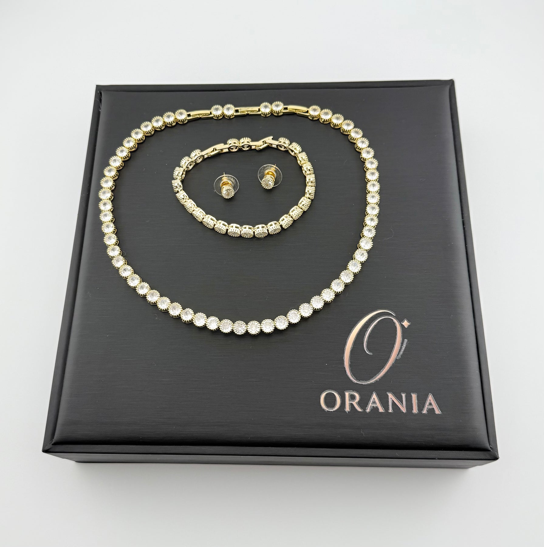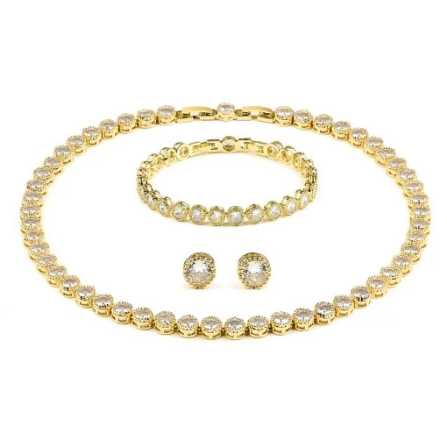 Un set complet format din colier, brățară și cercei, cu linie elegantă și strălucire uniformă, placat cu aur de 14k și pietre de zirconiu.